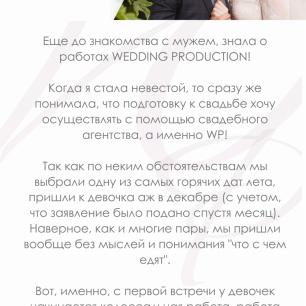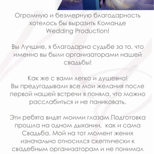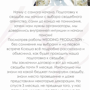 Обязательно созвонитесь со свадебным агентством. Уже по тому, как с вами будут разговаривать, вы сможете сделать вывод, хотите ли вы дальше продолжать общение с этими специалистами.